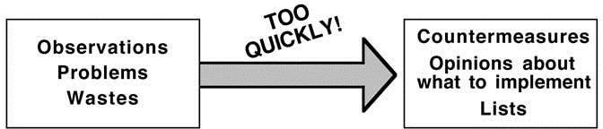 - We are jumping to countermeasures too A weakness in the list approach is a tendency to jump to countermeasures before we understand a situation (Figure 2-3). Generating a list of action items and implementing several countermeasures, often simultaneously, reflects an unspoken goal of, essentially, just shut off the problem! People are rewarded for fixing a problem, for firefighting, not for analyzing, even though the problem may recur later because it was not yet sufficiently understood.