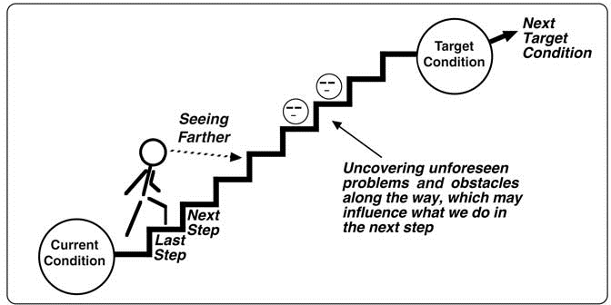 What was learned in the last step may have an influence on the next step. For this reason, Toyota works toward a target condition in small, rapid steps, with learning and adjustments occurring along the way. This is the equivalent of placing one foot in front of the other, one step at a time, and always adjusting to the present situation as necessary, and is quite different than working through the predefined steps of a plan or action-item list.