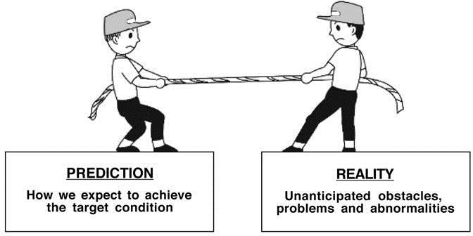 It is no different with target conditions—there too no one can aim so well up front as to always hit them. Regardless of how well you have planned, you will do well to assume that the way to the target condition is not completely clear; it is a gray zone (Figure 6-2).